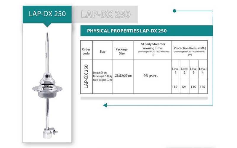 LIVA LAP-DX 250 Hoạt động trên nguyên lý phát tia tiên đạo, kim thu sét liva là sản phẩm của công nghệ hiện đại. Bán kính bảo vệ đạt cả tiêu chuẩn NFC 17-102 của Pháp, tiêu chuẩn IEC61083 và IEC 60060.