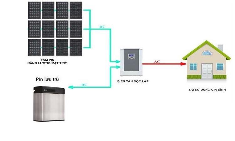 – Điện 1 chiều (DC) từ biến tần tích hợp sạc cung cấp cho thiết bị dùng điện xoay chiều (AC).