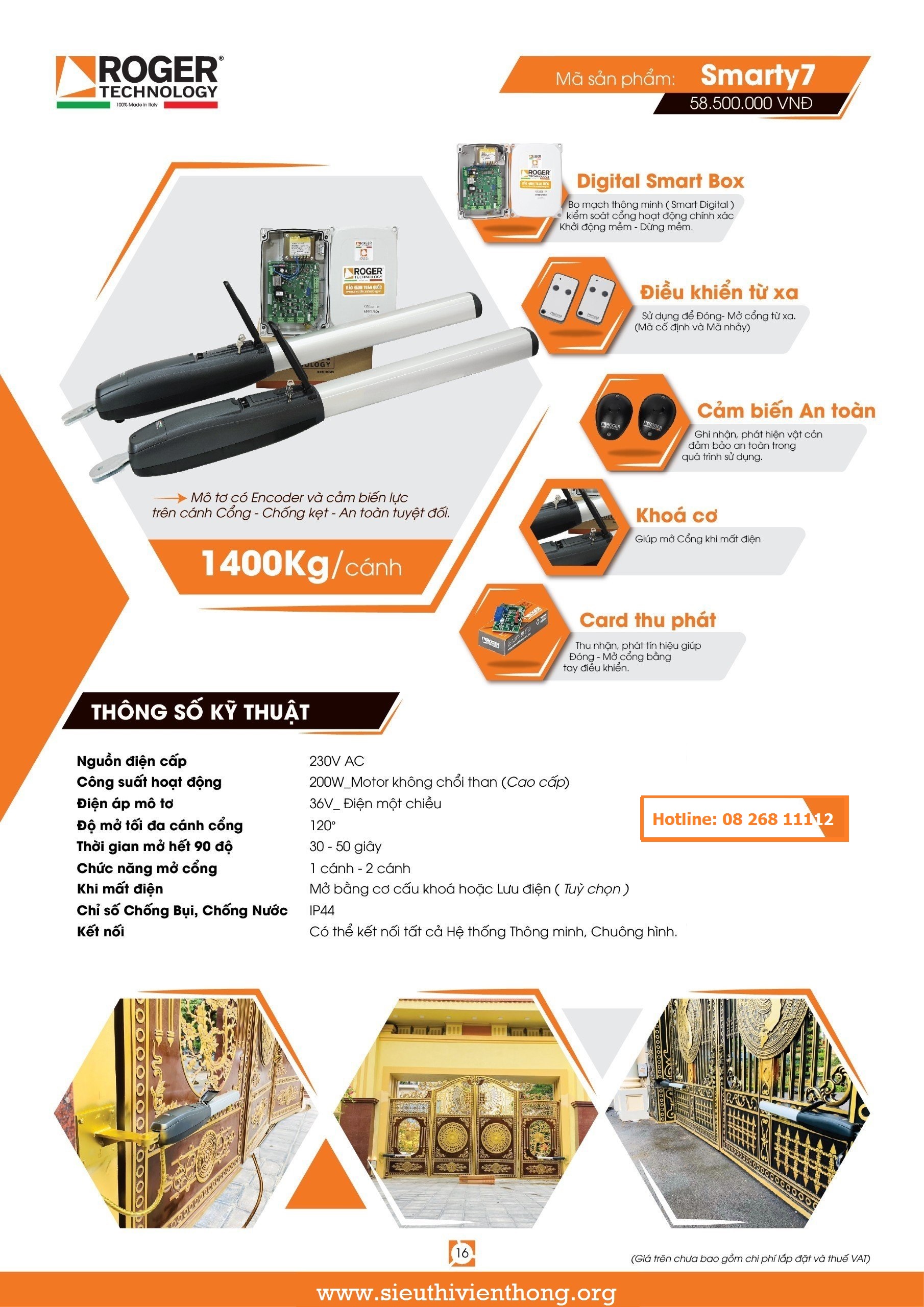 Mortor cánh tay đòn Roger Smarty 7 có công suất 200W cho phép tốc độ 1.6ms/s giúp đóng mở cổng chỉ từ 35-50 giây. Cánh tay đòn hành trình có thể điều chỉnh dài và ngắn giúp lắp cho cổng dài đến 7m và góc mở từ 90-120*.