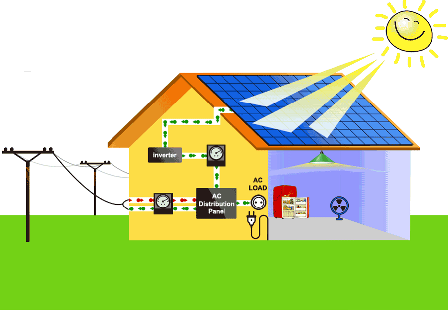 Ban ngày, các tấm pin của hệ sẽ thu năng lượng từ ánh nắng mặt trời khi chiếu xuống bề mặt của tế bào quang điện, tấm pin sẽ đóng vai trò biến đổi quang năng từ ánh sáng thành điện năng. Sau đó dòng điện này được đưa qua bộ inverter năng lượng mặt trời biến dòng điện 1 chiều thành xoay chiều để tương thích với các thiết bị gia dụng trong nhà