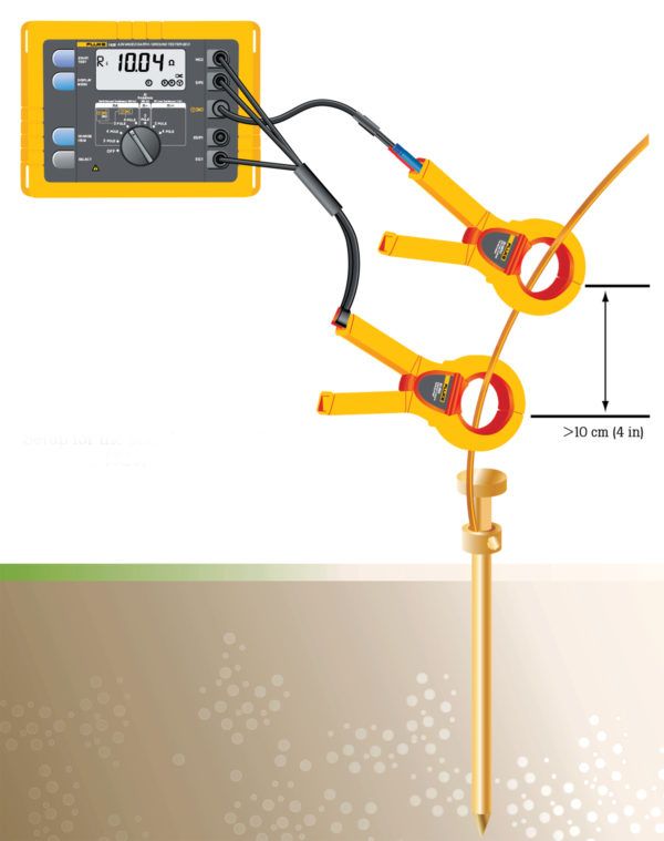Tiếp đến, bố trí các điện áp cực và điện áp dòng tương tự như phương pháp đo 3 cực. Tuy nhiên, dòng điện được đo bởi kìm cố định trên cọc nối đất. Khi đó, đồng hồ đo sẽ tính điện trở bằng giá trị của dòng điện chạy qua hệ thống cọc nối đất.