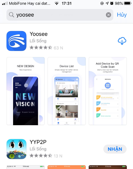 - Với điện thoại IPhone sử dụng hệ điều hành IOS : Vào App Store Trên điện thoại gõ tìm kiếm từ YOSSEE và cài đặt ứng dụng có tên YOSEE