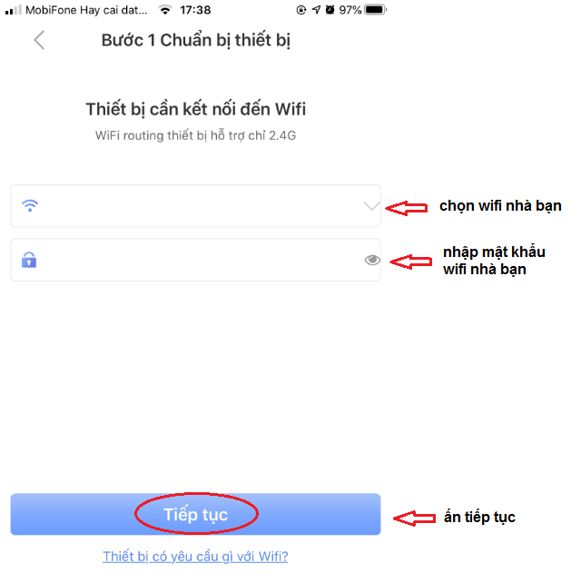 Bước 5 : Màn hình tiếp theo, bạn chọn Wifi tại nơi lắp đặt camera wifi + Nhập mật khẩu Wifi. Nhấp TIẾP TỤC