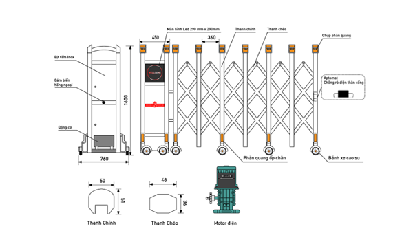 Ngoài ra, cổng xếp chạy điện còn có hệ thống màn hình led hiển thị tên công ty, báo hiệu, hướng dẫn, ngày tháng… có thể lắp đặt ở phần đầu cổng theo yêu cầu của từng khách hàng.