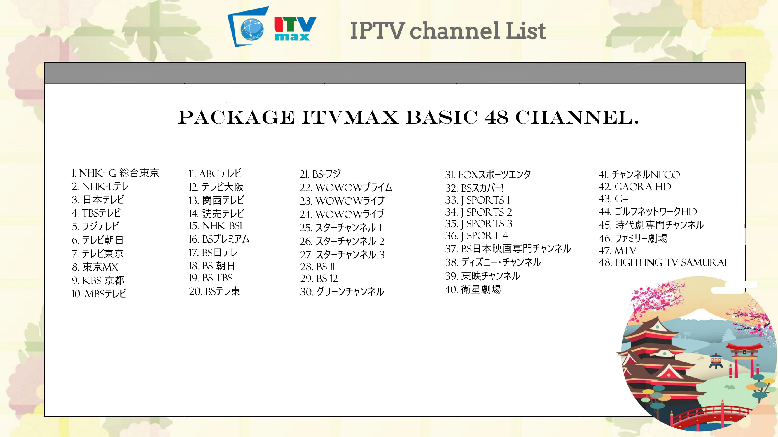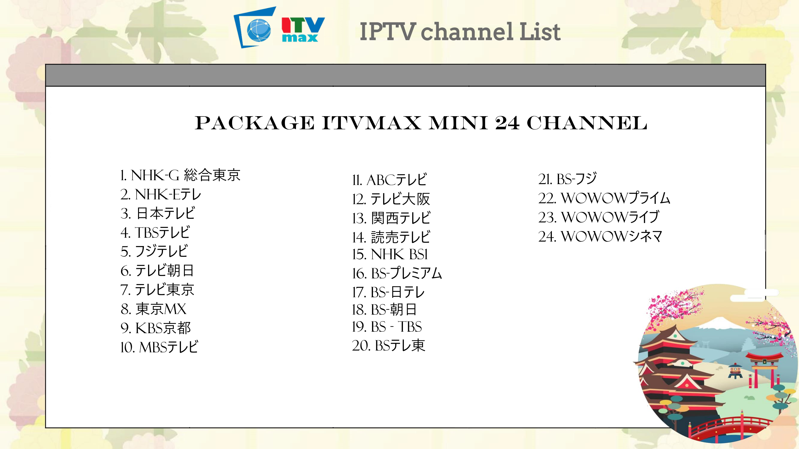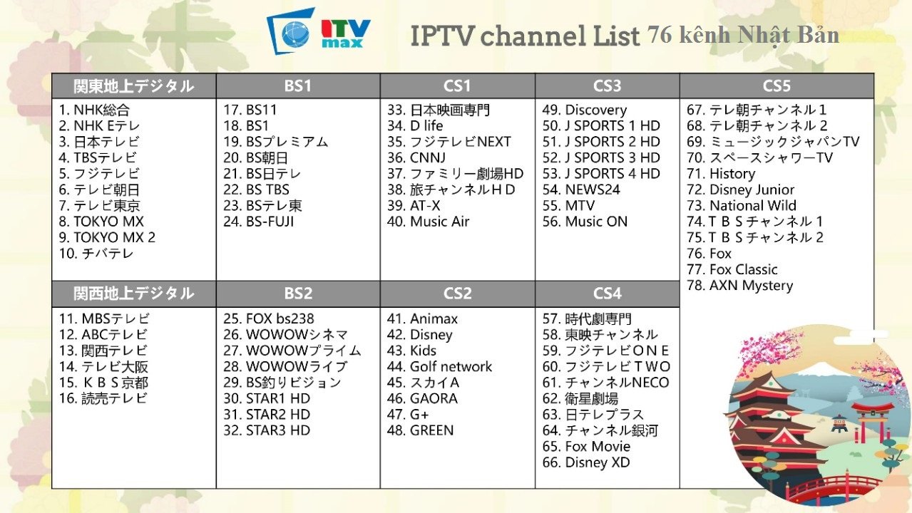 Ngoài ra chúng tôi còn cung cấp gói kênh Nhật Bản với nhiều kênh truyền hình đặc sắc: List kênh truyền hình Nhật Bản như NHK, Nihon TV, NHKE, TOKYO-MX, TBS, Fuji TV, Asahi TV, Tokyo TV, BS1, BS-2, BS-Ntv, BS HIVISION, BS-II, BS-TBS, BS JAPAN, BS12-Twellv, WOWOW, STAR-hv, Kids, Golf, Discovery, HISTORY, J SPORTS PLUS, J SPORTS ESPN, MOVIE PLUS, Yomiuri TV, Mainichi, Kansai Hoso, KBS,…..