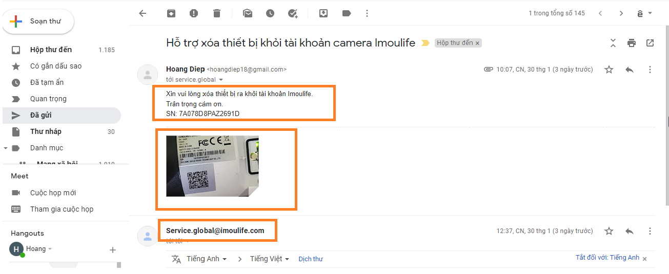 1. Bạn gửi mail cho tổng đài nhờ hỗ trợ xóa tài khoản với nội dung và hình serial của thiết bị theo mầu hướng dẫn sau.