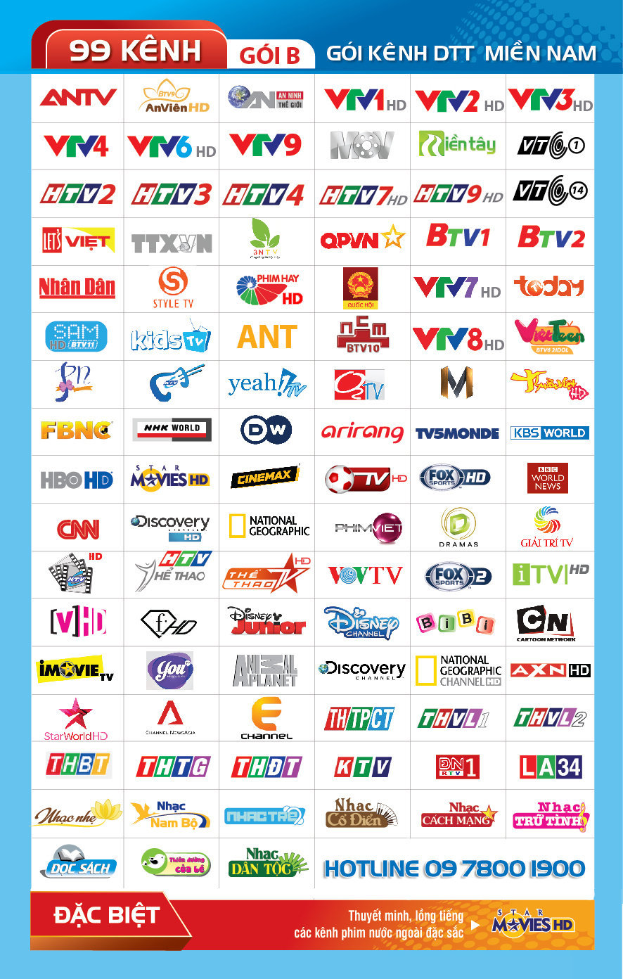 Gói B bao gồm 65 kênh cơ bản của gói A và 26 kênh quốc tế đặc sắc, được đông đảo khán giả Việt yêu thích như HBO, FoxMovie ( StarMovie ) , Cinemax, AXN, StarWorld, Discovery, National, … các kênh này đều được phát ở định dạng Full HD.