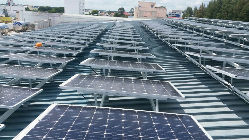 Mức hấp thu năng lượng mặt trời tại nước ta là khoảng 4.58 kWh/m2/ngày cho nên lấy tổng số Watt-hour các tấm pin mặt trời cần cung cấp chia cho 4.58 ta sẽ có tổng số công suất Wp của tấm pin mặt trời. Có những vùng mức hấp thu năng lượng mặt trời lớn hơn và cũng có những vùng nhỏ hơn. Trong tính toán có thể tính trung bình là 4 kWh/m2/ngày.