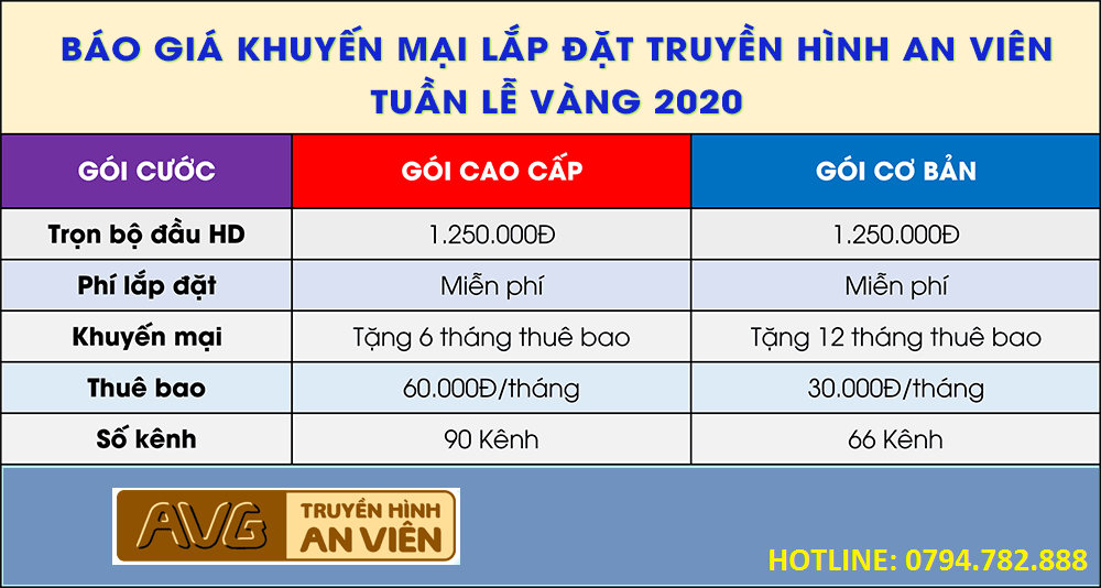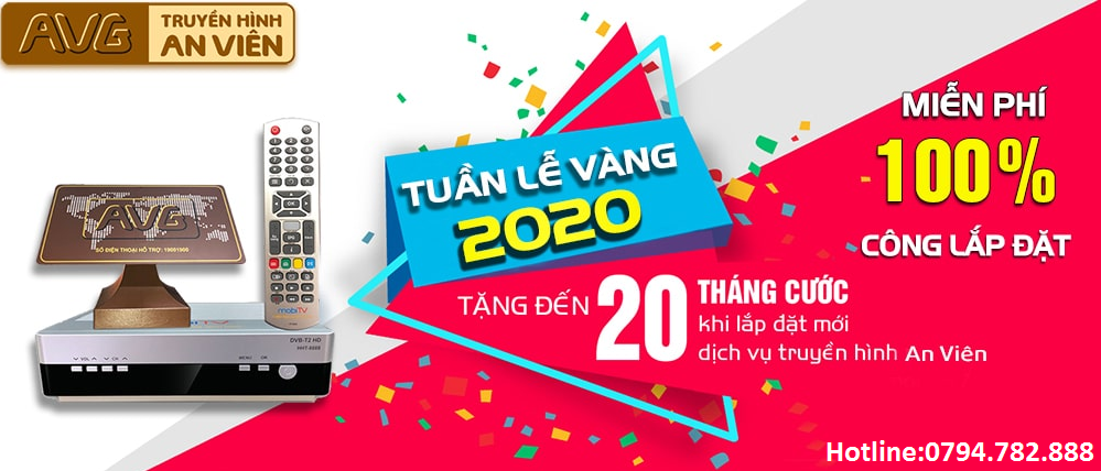 Từ ngày 10/4 đến hết 10/5 năm 2020 TRUYỀN HÌNH AN VIÊN áp dụng chương trình khuyến mại “TUẦN LỄ VÀNG 2020” cho thuê bao đăng ký lắp đặt mới. Cụ thể khi khách hàng đăng ký lắp Truyền hình An Viên (MobiTV) được miễn phí thuê bao 12 tháng đối với gói cơ bản, Miễn phí 6 tháng thuê bao đối với gói cao cấp, giảm giá trọn bộ thiết bị chỉ 1.250.000đ.